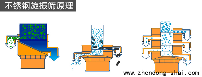 研磨材料通過(guò)不銹鋼旋振篩入料口進(jìn)入設(shè)備內(nèi),根據(jù)不同篩分要求,物料會(huì)經(jīng)過(guò)1-5層不同目數(shù)的篩網(wǎng),并且在這個(gè)過(guò)程中,位于各層的篩網(wǎng)下的彈跳球不斷撞擊篩網(wǎng),使物料能夠順暢的篩分,避免物料堵網(wǎng),不同規(guī)格的物料通過(guò)各層對(duì)應(yīng)目數(shù)的篩網(wǎng)從其出料口排出,終實(shí)現(xiàn)篩分或過(guò)濾作業(yè)。調(diào)節(jié)上、下兩端的相位角,還可以改變物料在篩面上的運(yùn)動(dòng)軌跡。