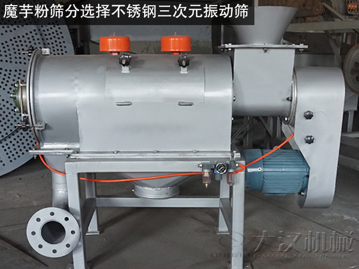 大漢機(jī)械的技術(shù)人員根據(jù)魔芋粉的特性選擇使用不銹鋼三次元振動篩,進(jìn)行對其篩分作業(yè)。