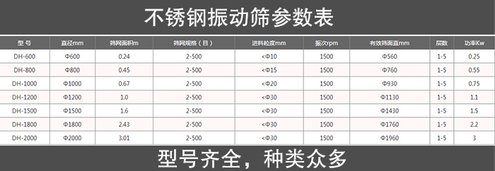 不銹鋼直線振動(dòng)篩是在碳鋼直線振動(dòng)篩的基礎(chǔ)上采用了不銹鋼材質(zhì),但是也是有所差異的,大漢的不銹鋼直線振動(dòng)篩不只有半不銹鋼材質(zhì)的,還有全不銹鋼材質(zhì)的,型號(hào)種類非常齊全,具體參數(shù)詳見(jiàn)上圖參數(shù)表。