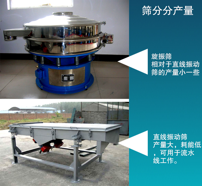 旋振篩相對于直線振動篩的產(chǎn)量小一些,直線振動篩產(chǎn)量大,耗能低,可用于流水線工作。