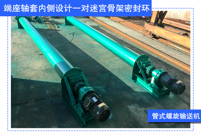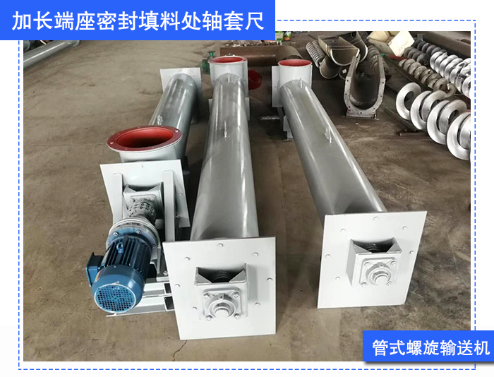 管式螺旋輸送機(jī)加長端座密封填料處軸套尺寸,這樣就增加了盤根的圈數(shù),增強(qiáng)了密封效果。