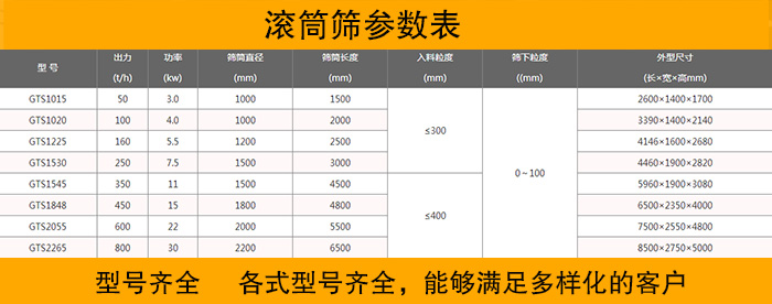 大漢作為專業(yè)的滾筒篩生產(chǎn)廠家,積累了大量的生產(chǎn)經(jīng)驗(yàn)和技術(shù),能夠生產(chǎn)的滾筒篩型號和種類多種多樣,滿足各種各樣的用戶需求,并且可以在客戶提出特殊的需要時,也完全有能力設(shè)計出適合客戶的方案,定制其需要的產(chǎn)品。