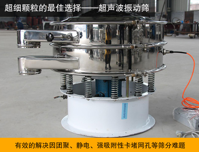 超聲筆振動(dòng)篩是在傳統(tǒng)振動(dòng)篩的基礎(chǔ)上安裝了一個(gè)低振幅、高頻率的超聲振動(dòng)波(機(jī)械波),以改善超微細(xì)粉體的篩分性能,廣泛應(yīng)用于制藥、冶金、化工、選礦、食品等要求精細(xì)篩分過濾的行業(yè)。篩分過濾精度高,能有效的解決因團(tuán)聚、靜電、強(qiáng)吸附性卡堵網(wǎng)孔等篩分難題,是當(dāng)前網(wǎng)孔堵塞有效的解決方法。針對(duì)超細(xì)顆粒合金粉末高精細(xì)、高靜電、高密度、輕比重的特性,超聲波振動(dòng)篩可以輕而易舉的解決,是極其適合的設(shè)備。