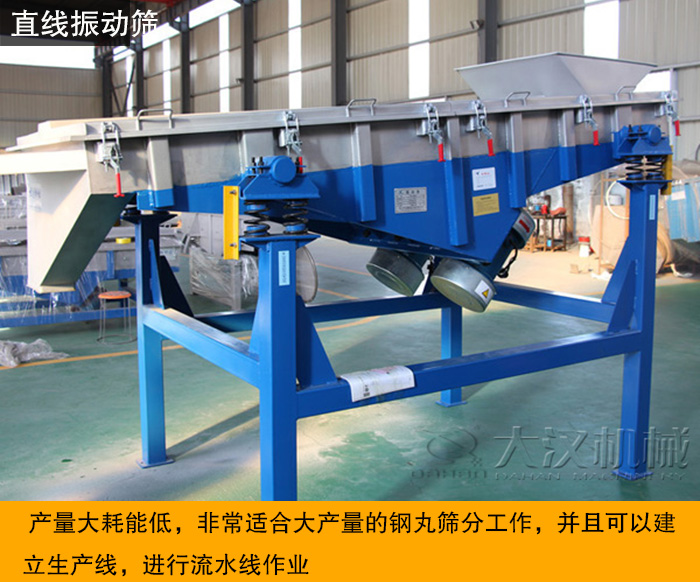 直線振動(dòng)篩采用振動(dòng)電機(jī)激振作為振動(dòng)源,使物料在篩網(wǎng)上被拋起,同時(shí)向前做直線運(yùn)動(dòng),物料從給料機(jī)均勻地進(jìn)入篩分機(jī)的進(jìn)料口,通過多層的篩網(wǎng)產(chǎn)生多種規(guī)格的篩上物、篩下物,分別從各自的出口排出。直線振動(dòng)篩可以分離多種規(guī)格的鋼丸。適用于對(duì)其篩選和分級(jí)。