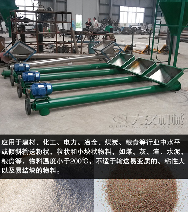 螺旋輸送機廣泛應(yīng)用于建材、化工、電力、冶金、煤炭、糧食等行業(yè)中水平或傾斜輸送粉狀、粒狀和小塊狀物料,如煤、灰、渣、水泥、糧食等,物料溫度小于200℃,不適于輸送易變質(zhì)的、粘性大以及易結(jié)塊的物料。